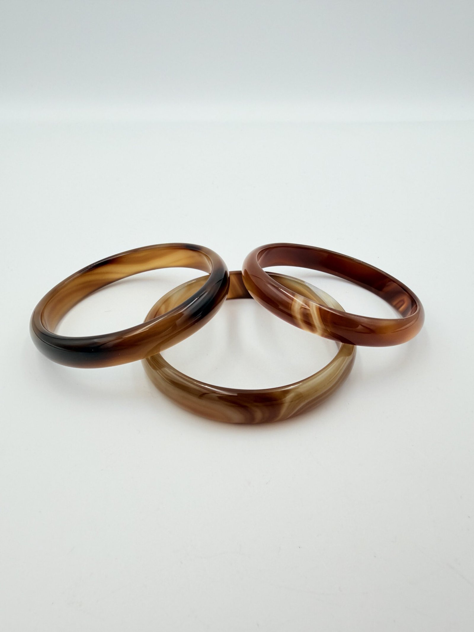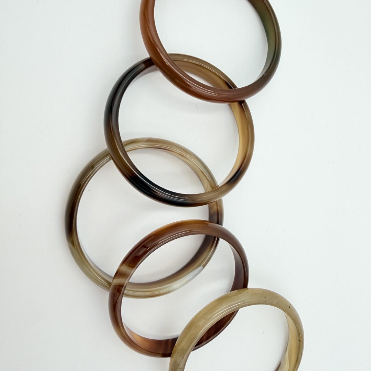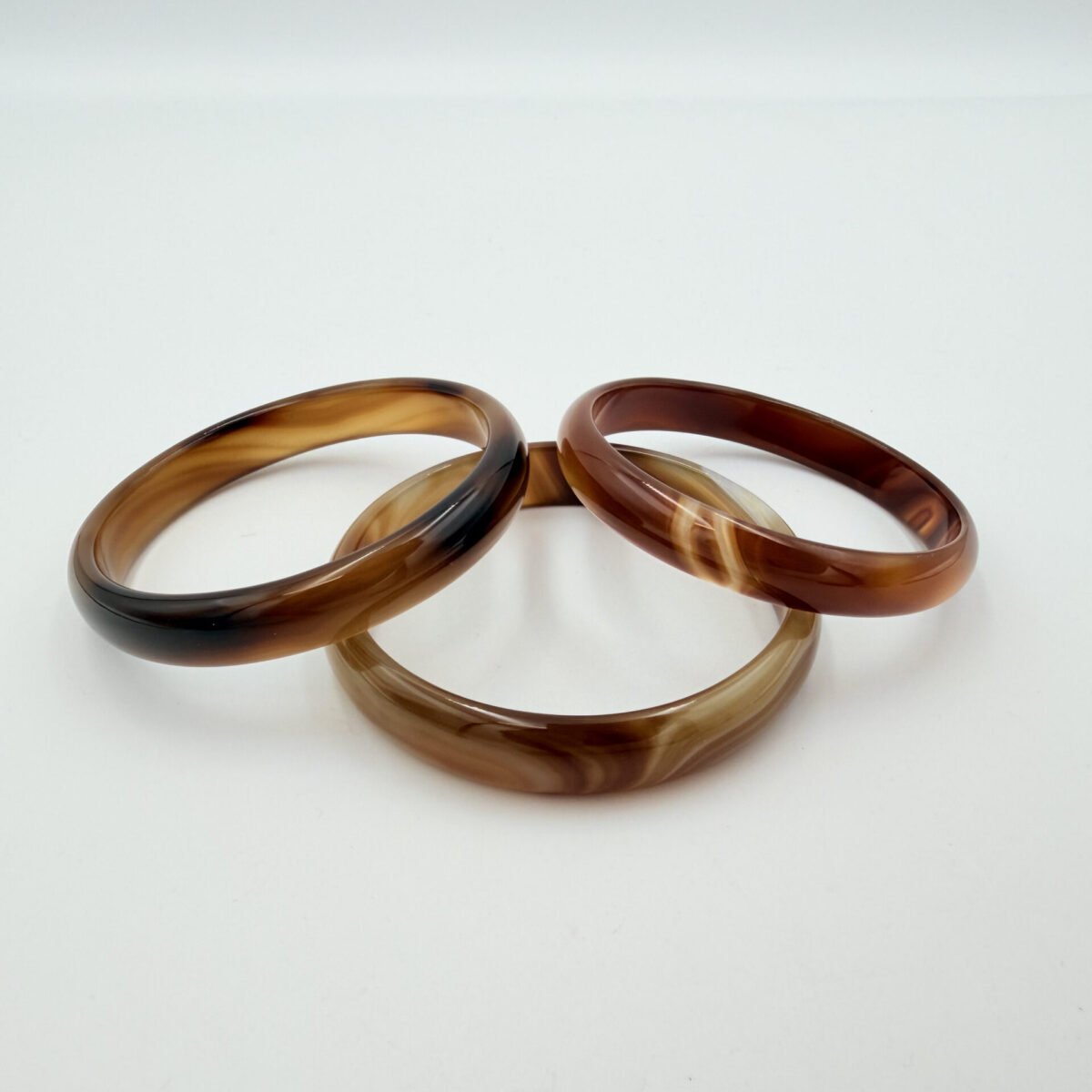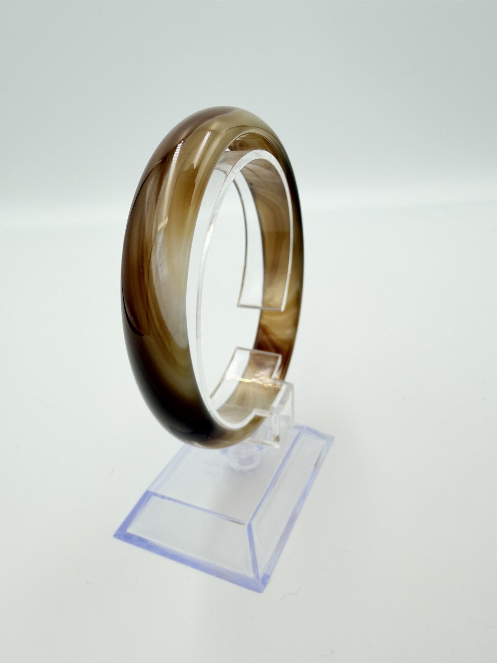 This natural Sulemani agate bangle features a warm, creamy mocha base with elegant chocolate-brown swirls and fine “silk” banding. The patterns flow organically around the stone, creating a soft, marbled aesthetic that transitions from translucent tan to deep espresso. Meticulously polished to a high-gloss finish, it features an inner diameter of 60mm to 70mm and a width of 7-12mm. In crystal healing, brown agate is a powerful grounding stone. it is believed to bring stability and composure, helping the wearer remain centered and calm during stressful situations.