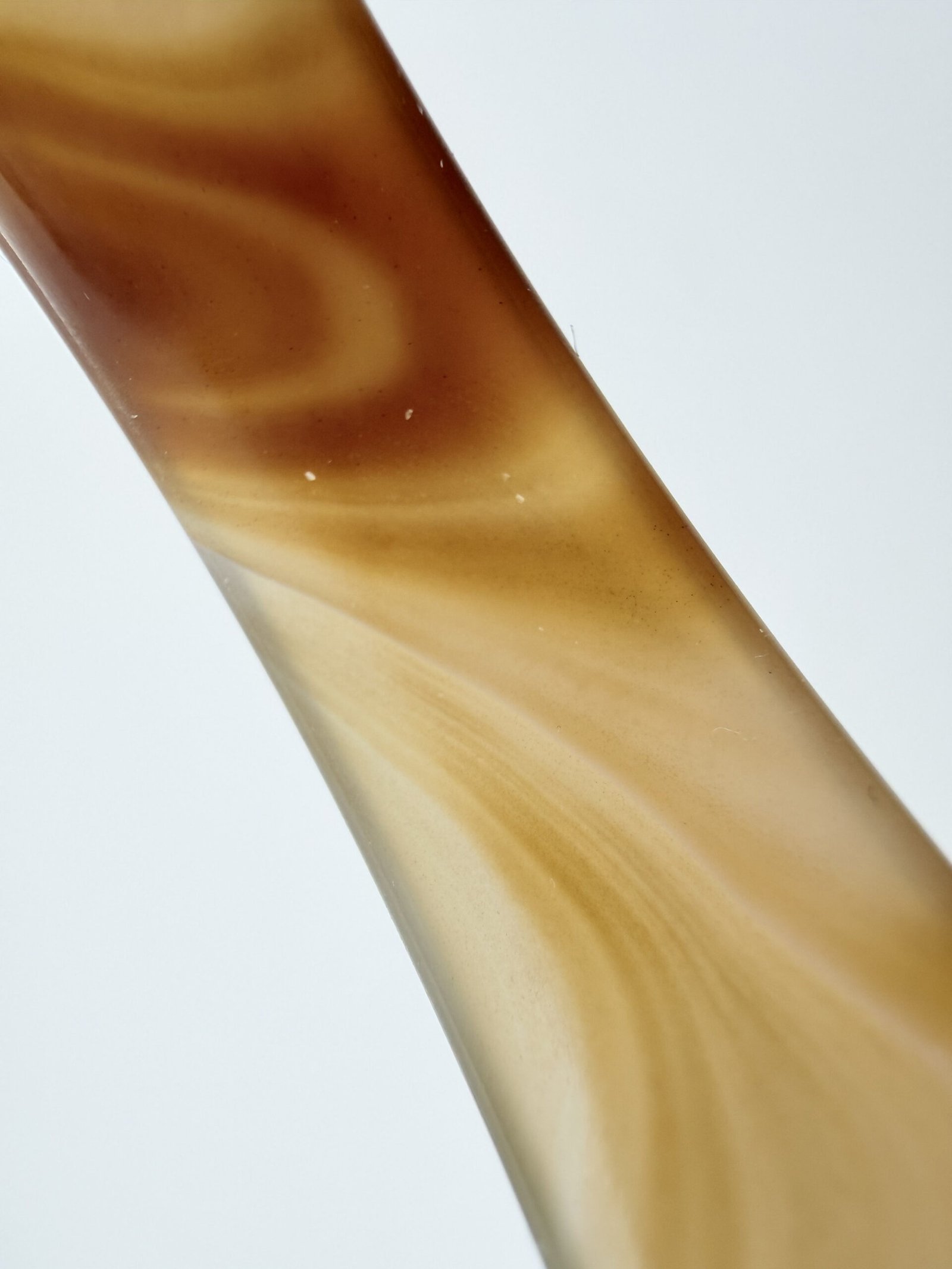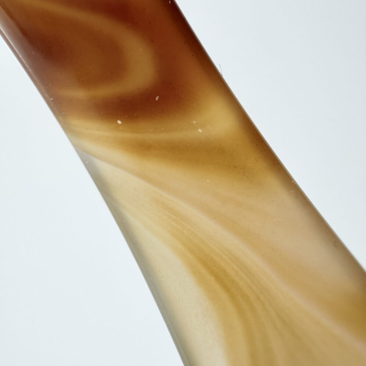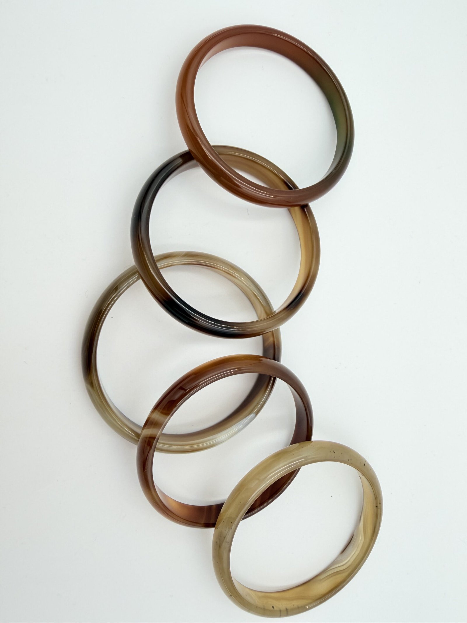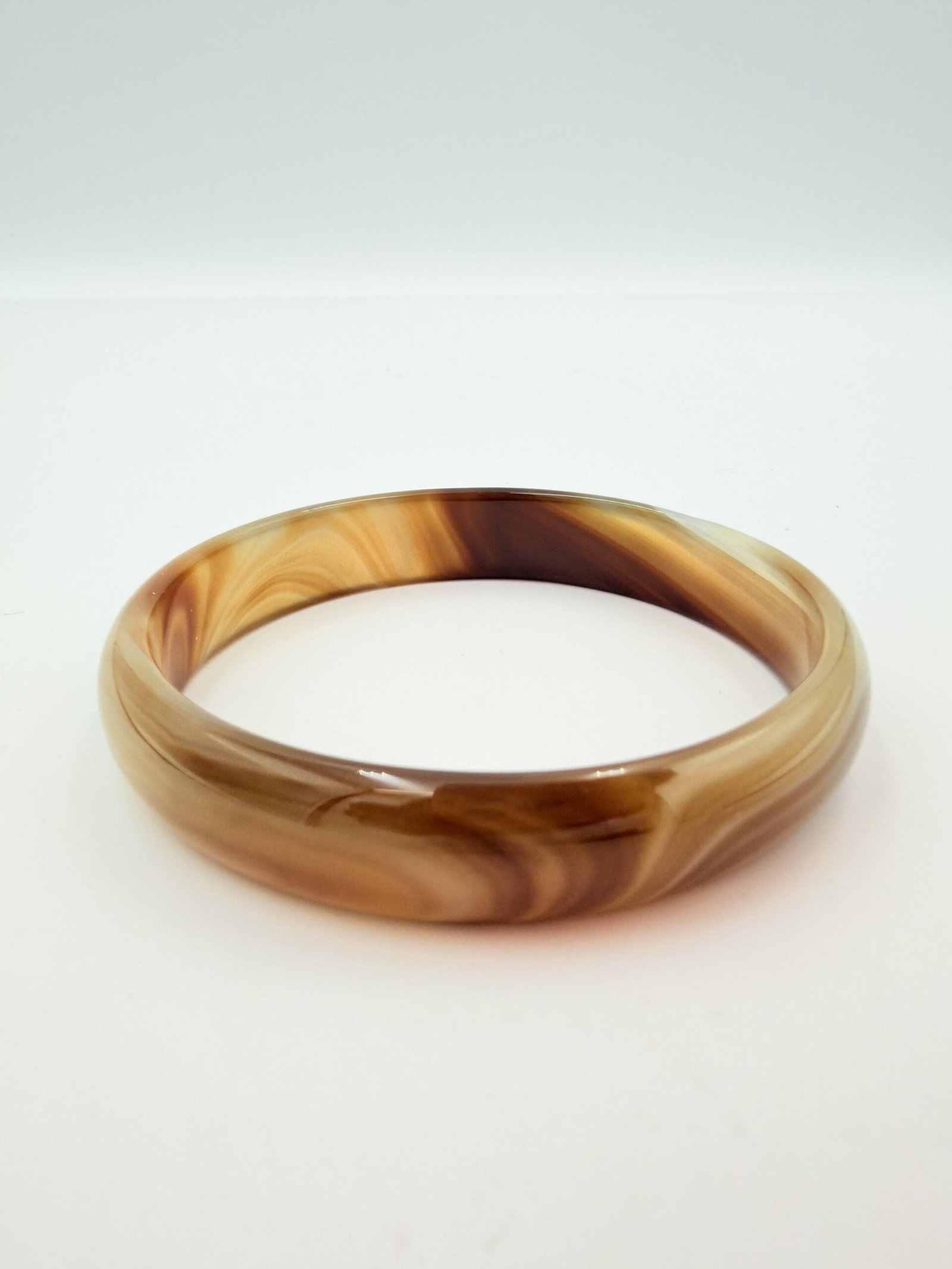 This natural Sulemani agate bangle features a warm, creamy mocha base with elegant chocolate-brown swirls and fine “silk” banding. The patterns flow organically around the stone, creating a soft, marbled aesthetic that transitions from translucent tan to deep espresso. Meticulously polished to a high-gloss finish, it features an inner diameter of 60mm to 70mm and a width of 7-12mm. In crystal healing, brown agate is a powerful grounding stone. it is believed to bring stability and composure, helping the wearer remain centered and calm during stressful situations.
