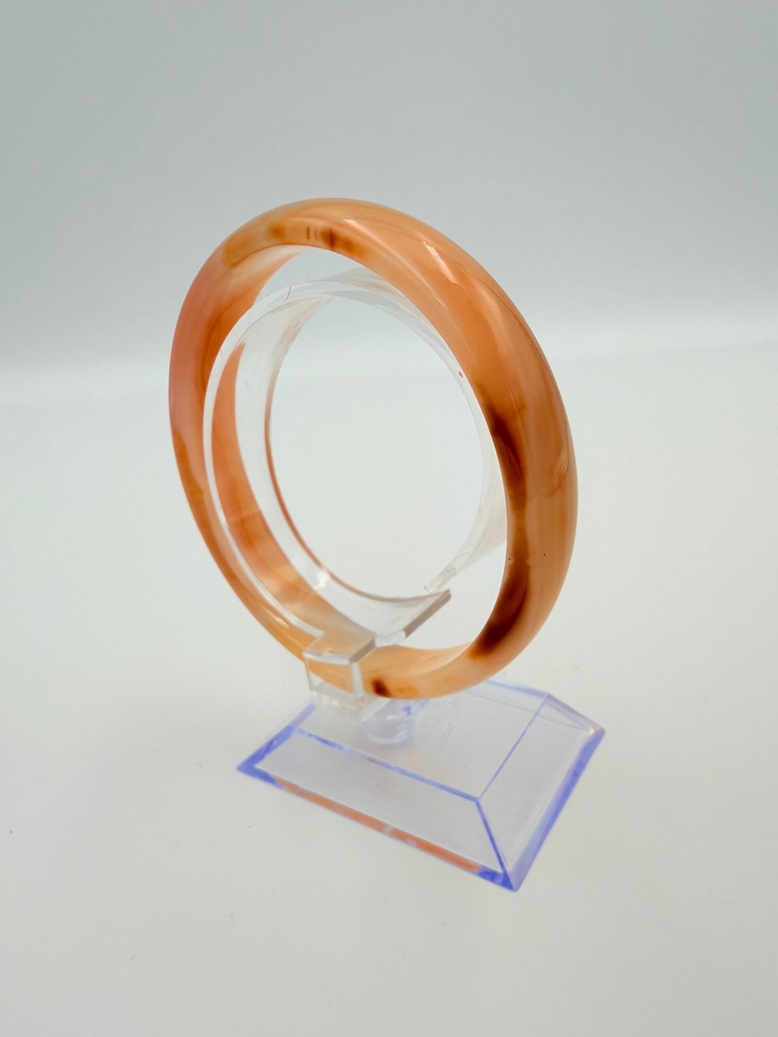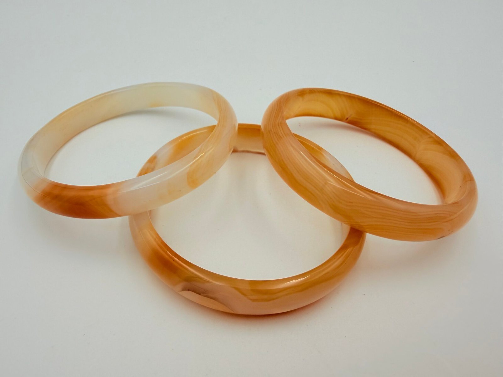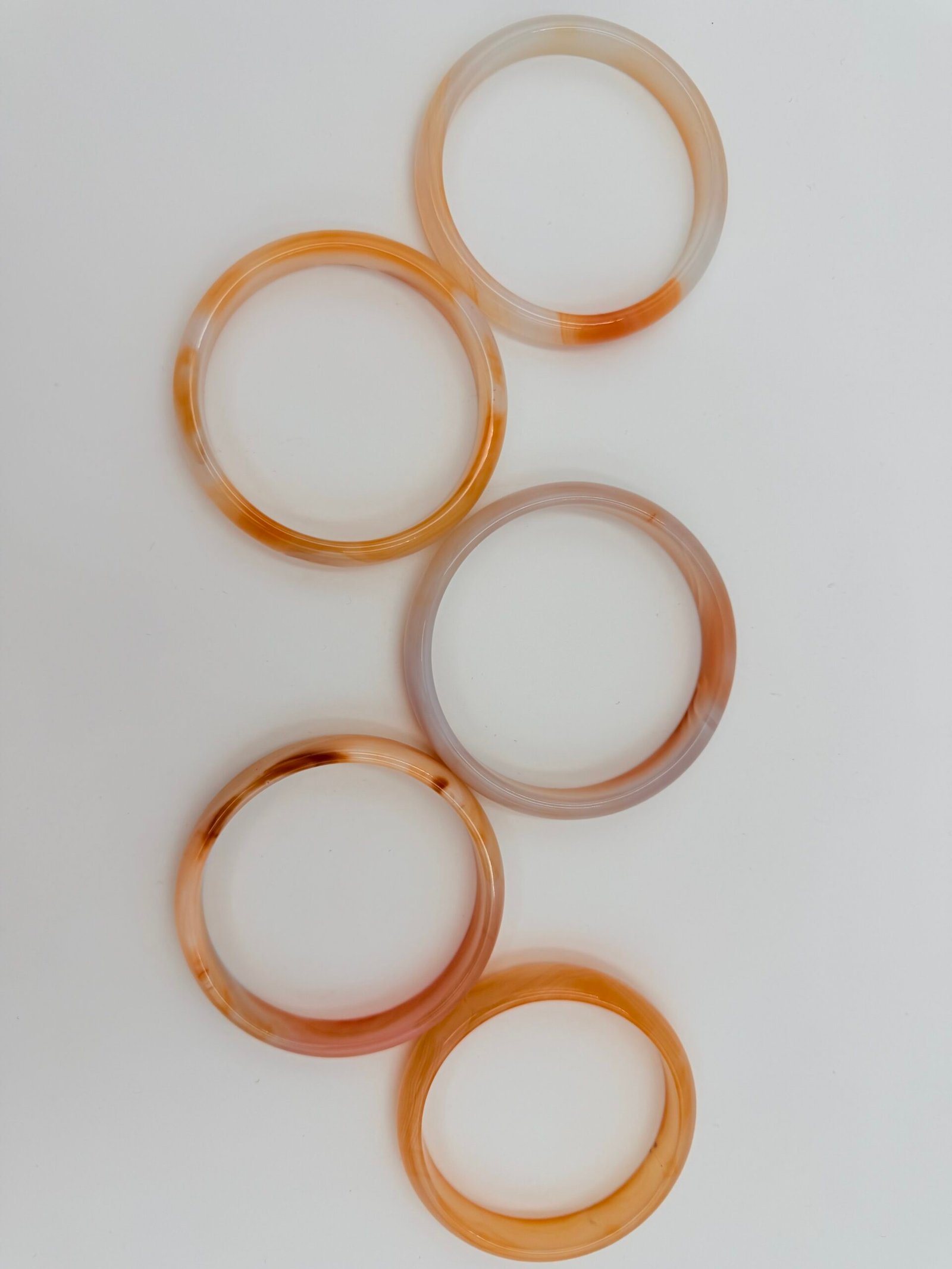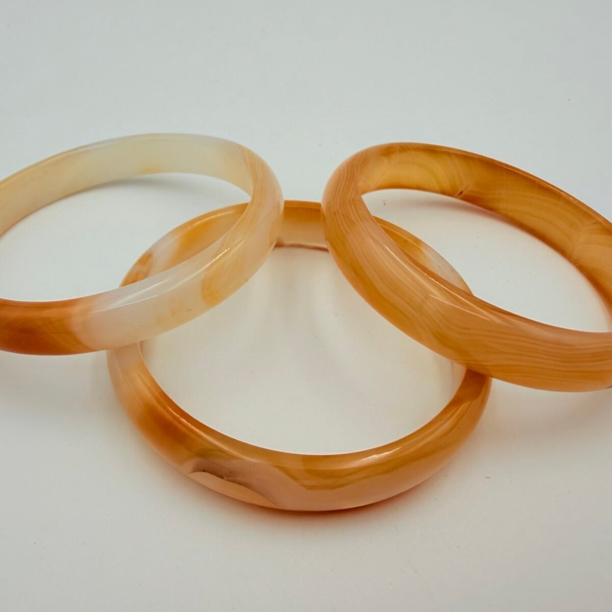 The Agate displays a stunning variety of translucent amber, deep carnelian, and mossy brown tones. As a natural earth-mined stone, every bangle is unique; yours will feature its own distinct patterns of organic banding and internal inclusions, ensuring no two pieces are ever the same.