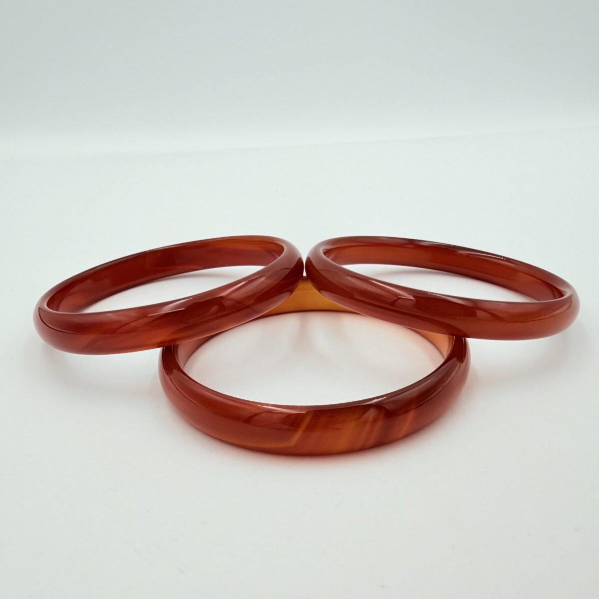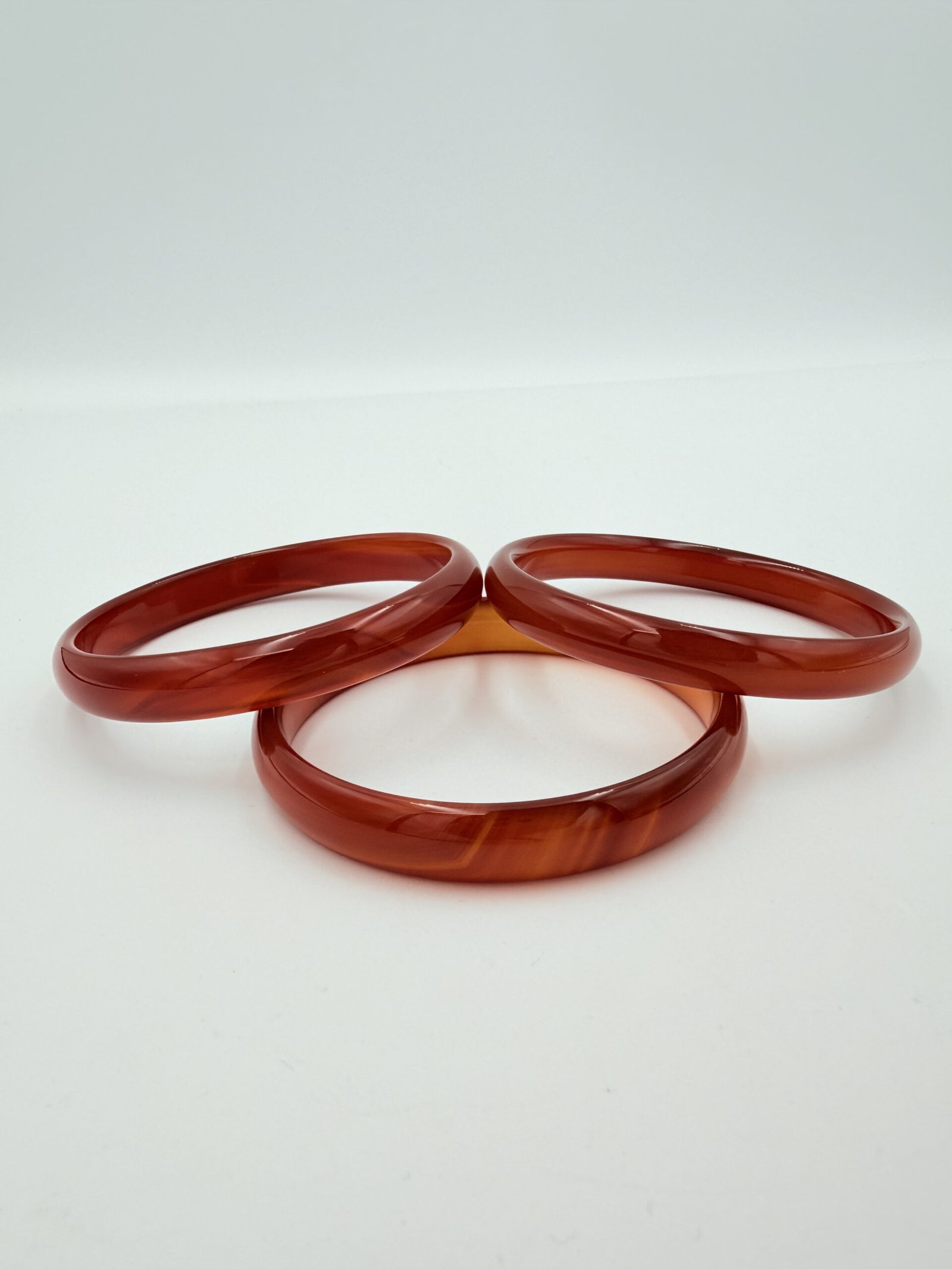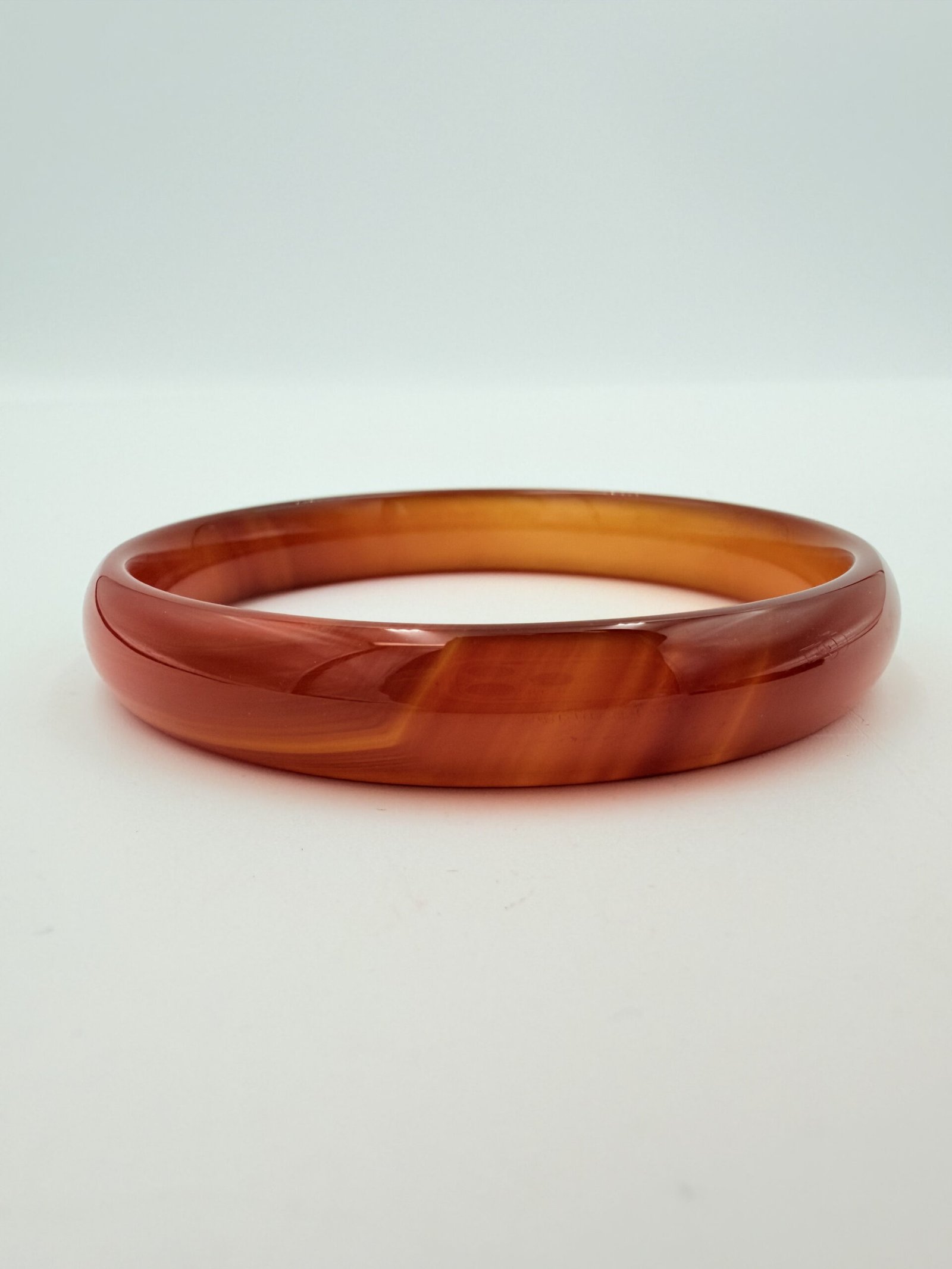 A radiant Natural Orange Agate Bangle featuring elegant translucent banding and a high-gloss finish. Sized at 60-70mm in diameter and 7-12mm wide, this vibrant gemstone bracelet provides a boost of creativity, confidence, and warm grounding energy.